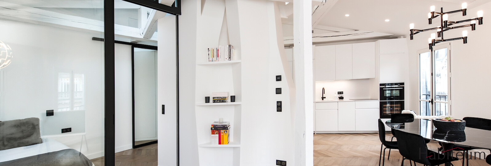 Notre client souhaitait également que son appartement soit le plus fonctionnel possible. Ainsi, les nouveaux Velux et le luminaire dissimulé sur les poutres sont désormais pilotés à distance grâce à l’installation domotique mise en place.