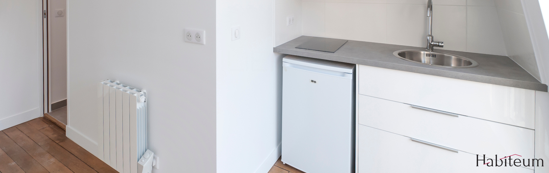 Le réseau d’eau et le réseau électrique ont été entièrement refaits. Le chauffage électrique a été ajouté et la fenêtre a été changée pour une meilleure étanchéité et un gain de luminosité. Le parquet ancien a été conservé mais entièrement nettoyé. Afin de créer une salle de douche avec toilettes, nous avons monté un mur de séparation. De l’autre côté, un coin kitchenette a été créé et pensé pour que tous les appareils nécessaires puissent trouver leur place. Des rangements sur mesure ont également été dessinés et posés.