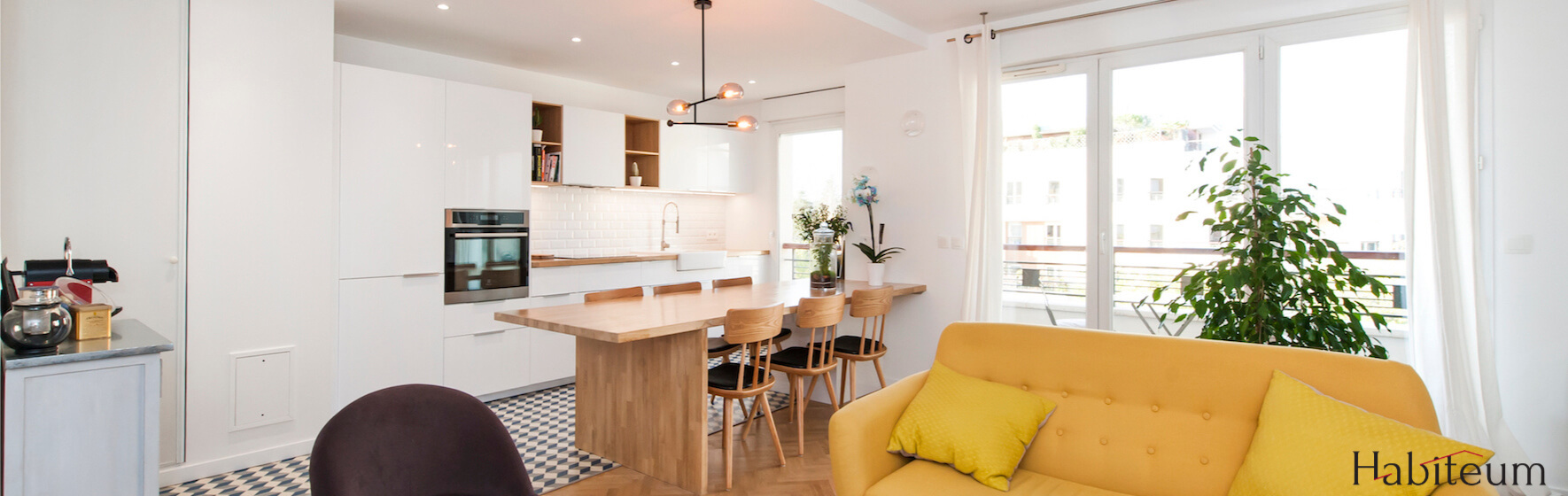 Les deux chambres ne nécessitant pas de travaux, le projet de rénovation de cet appartement situé à Bois-Colombes consistait à rénover uniquement la cuisine, le séjour et la salle de bain. En effet, Emilie et Jérôme souhaitaient une grande pièce à vivre ouverte sans perdre de place avec une salle à manger séparée. Nous avons donc entièrement détruit la cuisine existante pour notamment installer un plan de travail à hauteur de table (75 cm) pouvant accueillir 8 personnes. Comme pour les meubles de la cuisine, réalisés sur-mesure, nous avons opté pour un revêtement en bois massif. Nous avons également choisi un évier à poser ainsi qu’un carreau de ciment au sol qui marque la séparation entre la cuisine ouverte et la pièce à vivre. Une délimitation que l’on retrouve également volontairement en hauteur avec la création d’un faux plafond pour séparer les deux espaces et intégrer des spots côté cuisine.