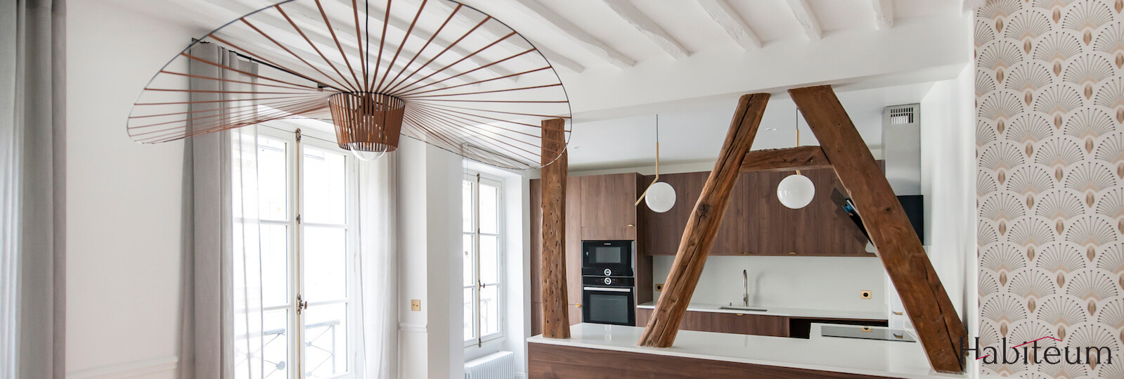 Dans cette optique, nous avons décidé d’abattre le mur porteur entre le séjour et la cuisine. Mais durant la démolition, nous sommes tombés sur une magnifique structure en bois masquée par le plâtre. Après validation de notre bureau d’études, nous avons pris le parti de conserver cette structure, tout en ouvrant les interstices entre chaque poutre pour obtenir plus d’espace.
